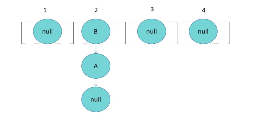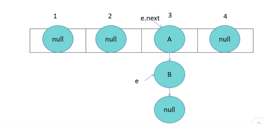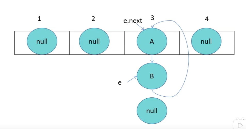 由于线程1已经指向了B和A,线程2却先一步执行了扩容操作,而停止循环的条件就是e.next为null,当执行完扩容后,线程1苏醒,此时e为B,e.next为A,当前e的next指向A,导致A与B之间产生死循环,颠倒后依旧产生连接,就形成了环。